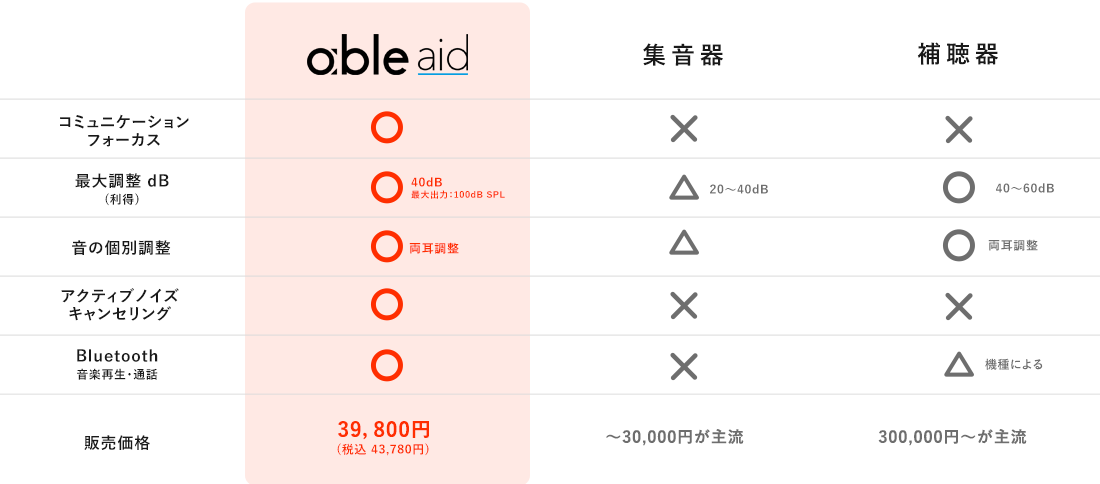 able aid のように、対話する相手の声以外の音を、相対的に小さくできる機能を搭載した商品はなかったので、本当に重宝しています。コミュニケーションフォーカス機能に感動しました。 -